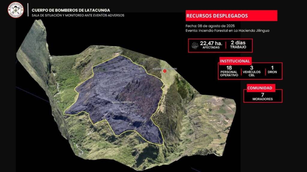 Desde distintos puntos de la ciudad de Latacunga se podía observar una densa columna de humo que alcanzaba aproximadamente los 60 metros de altura. En el lugar, un equipo de 18 bomberos forestales realizó labores de combate sobre un incendio superficial que involucraba material vegetal liviano y pesado, como pajonales, árboles de eucalipto y vegetación nativa, en una pendiente con inclinación aproximada de 50 grados.